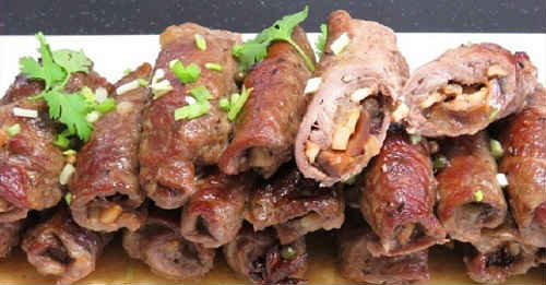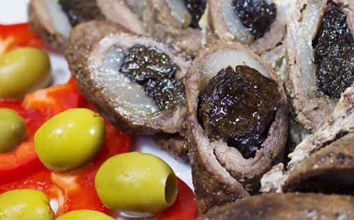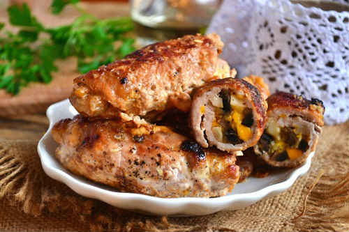 Страва виглядає апетитно, оригінально виглядає, завжди звертаючи на себе увагу гостей. З начинками можна і потрібно експериментувати. Кладіть чорнослив, сир, зелень, фісташки та інші горіхи. Чудова начинка вийде з беконом, салом, грибами, овочами. Зробити закуску можна з свинини, яловичини, курячого м’яса. Смачним страва буде в гарячому і холодному вигляді. Я пропоную лише приклади варіантів, але не забороняється додати щось від себе.