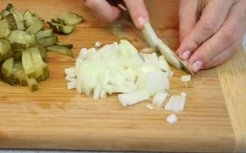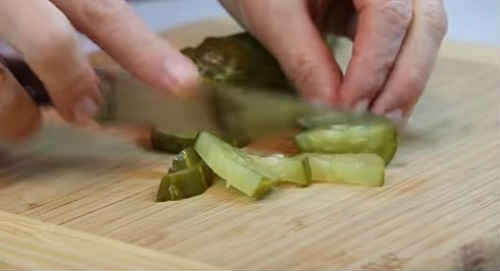 - Наріжте солоні огірочки уздовж довгими смужками. Покришіть бекон маленькими кубиками.