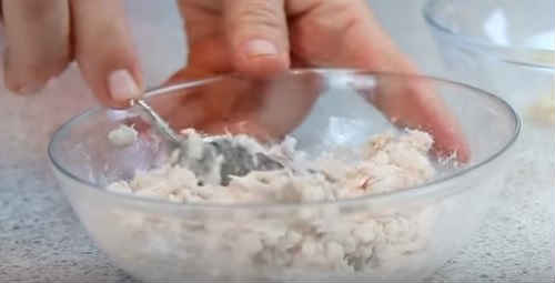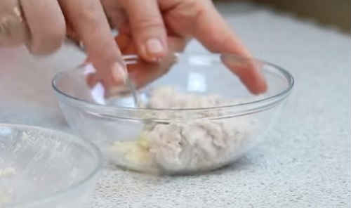 - Ненадовго заморозьте сирок в морозилці, потім потріть його разом з часточкою часнику, перемішайте.