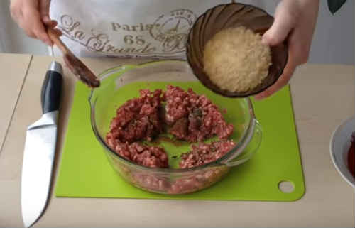 Засипте рис. З приводу пропорцій рису і фаршу ходить багато суперечок. Любите більше – не заборонено. Класична пропорція така: візуально розділіть масу фаршу на чотири частини. Рис додавайте в обсязі, рівним за кількістю однієї частини м’яса. Перемішайте продукти.