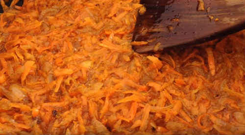 Дочекайтеся красивого рум’яного кольору, додайте моркву. Потріть коренеплід великої стружкою. Моркви можна брати менше, якщо не любите. Не наполягаю і на крупній тертці. Хочете – натирайте на тертці з дрібними отворами.