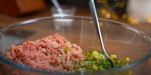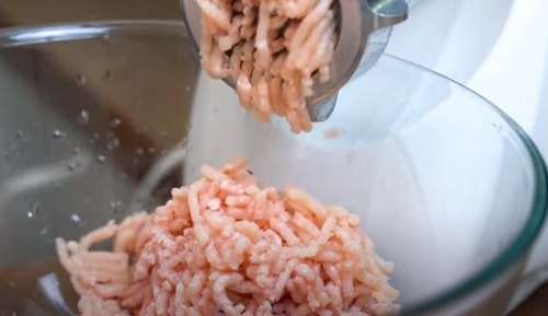 Якщо вирішите робити фарш самостійно, пропустіть свинину з куркою через м’ясорубку. В процесі подрібніть шматочок бекону.