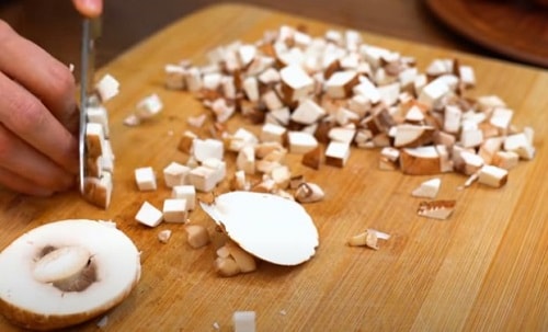 Покришіть печериці дуже маленькими кубиками.