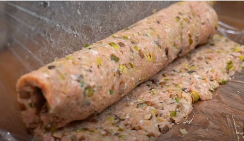 Піднявши плівку з краю, загорніть фарш рулетом. Допомагайте руками, трохи приминаючи конструкцію.