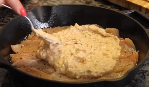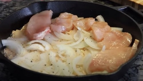 - Накрийте картопля шматочками курячого м'яса, зверху розподіліть цибулю, в якому маринувалося філе.