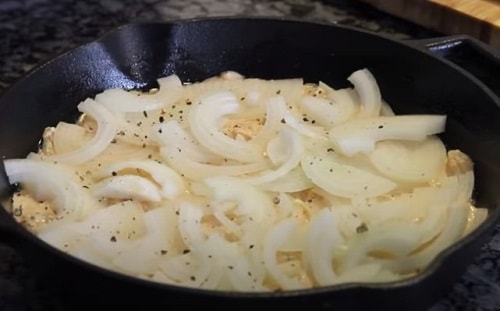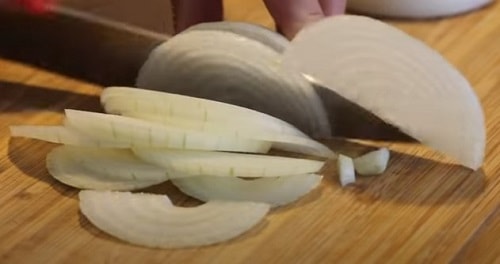 Настругати цибулини півкільцями. Раджу трохи обсмажити його на сковороді в маслі до красивої рум'яності, але якщо лінь, допустимо обійтися і так.