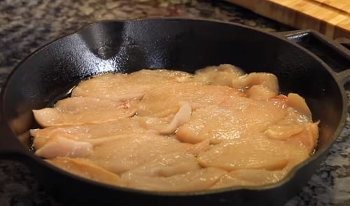 - Поділіть грудки на два стейка. Трохи відбийте, прикривши харчовою плівкою. Заправте спеціями, дайте постояти не менше чверті години.