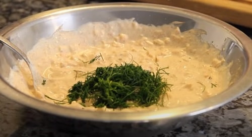 - Пролийте майонезом, розрівняйте соус. Можна замінити вершками, але тоді додайте велику ложку вершкового масла.