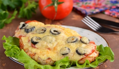 Страви, об'єднані загальним брендом «М'ясо по-французьки» завжди смачні, апетитно виглядають, а якщо приготувати їх з курки, а точніше, з філе грудки або стегна, то приємно порадують низькою калорійністю. Незалежно від обраного способу запікання, на сковороді або в духовці, страву буде красуватися рум'яної сирної скоринкою. А під нею, крім м'яса, можна помістити купу різних продуктів: помідори, гриби, картоплю і навіть ананаси.