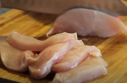 Наріжте грудку курки поперек волокон невеликими шматочками. Не робіть занадто дрібними, щоб м'ясо не загубилося в страві, а й великими шматками також не варто.