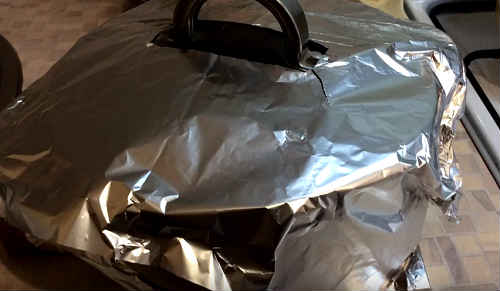 Складіть удвічі аркуш фольги, зробіть проріз для ручки кришки.
