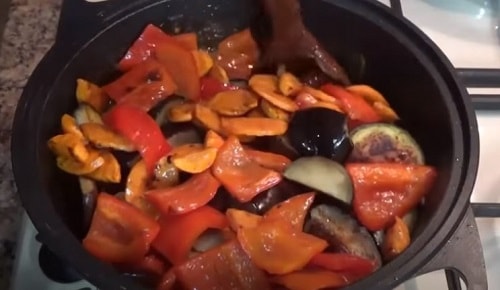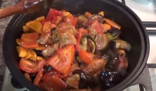 Овочеве рагу з м'ясом, рецепт якого можна підкоригувати на свій розсуд. В даному варіанті використовується літньо-осінній набір, коли дозріває більшість з овочів. Взимку ви зможете готувати з заморожених сумішей, додавши брокколі, стручкову квасолю, цвітну капусту, зелений горошок, квасоля.