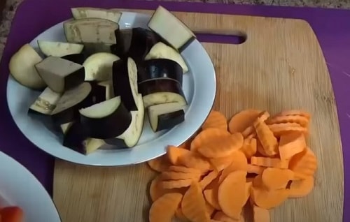 Морквину настругати кільцями. Баклажани наріжте товстими півкільцями.