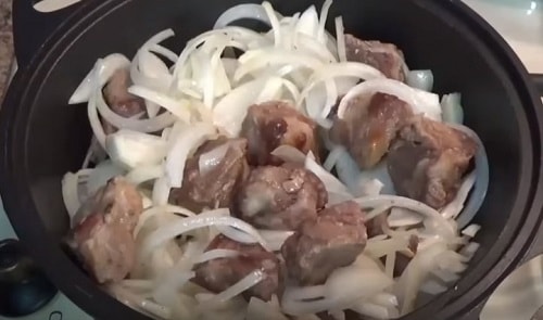 Наріжте цибулини четвертинками кілець, відправте до м'яса. Перші кілька хвилин готуйте на повному вогні. Потім зменшіть до помірного.
