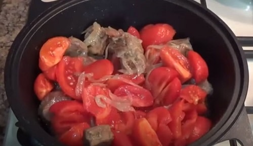 - Додайте в сковороду з шматочками м'яса томати. Продовжуйте смажити, поки основна частина виділеного помідорами соку не випарується.