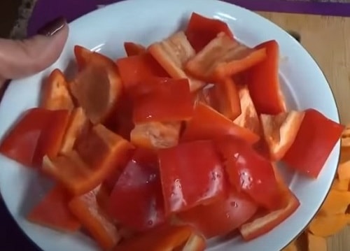 Видаліть з солодких перців насіннєву частина. М'якоть покришите шматочками, як на фото, не дуже дрібно.