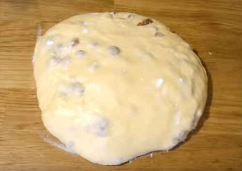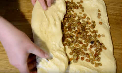 Увага! Тут є невеликий секрет. Щоб легко ввести родзинки в масу, розпластайте тісто, насипте зверху родзинки. Потім скрутіть рулетом, конвертом. Трохи пам’ятаєте конверт руками, потім накрийте мискою. Залиште для відпочинку та дозрівання на чверть години. Клейковина розслабиться, і родзинки легко «втрутиться», залишиться тільки ще трохи попрацювати руками.