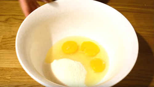 Засипте в глибоку посудину цукор, вбийте яйця. Збивайте міксером до легкої білизни суміші. Продукти обов’язково повинні бути кімнатної температури, це важливо.