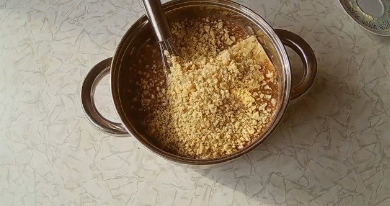 Додати подрібнені горіхи і перемішати все ложкою.
