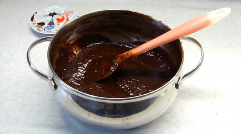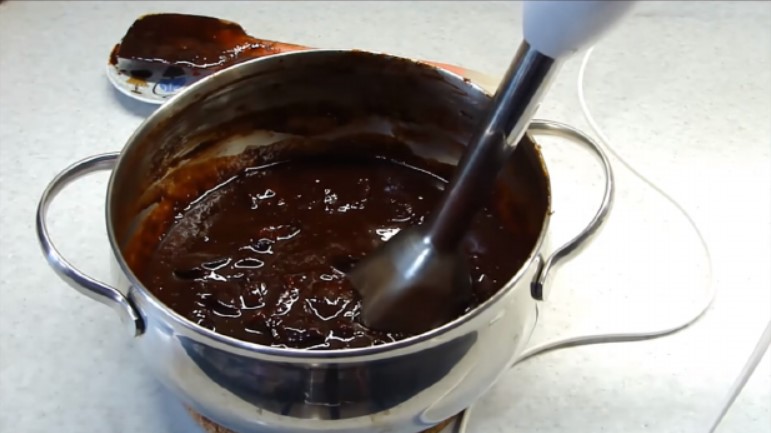 У миску з пастою покласти кубик розм’якшеного вершкового масла, ретельно перемішати. Після охолодження консистенція десерту виявиться максимально схожою на оригінал. Смак – вершково-шоколадний з легкої сливової кислинкою.