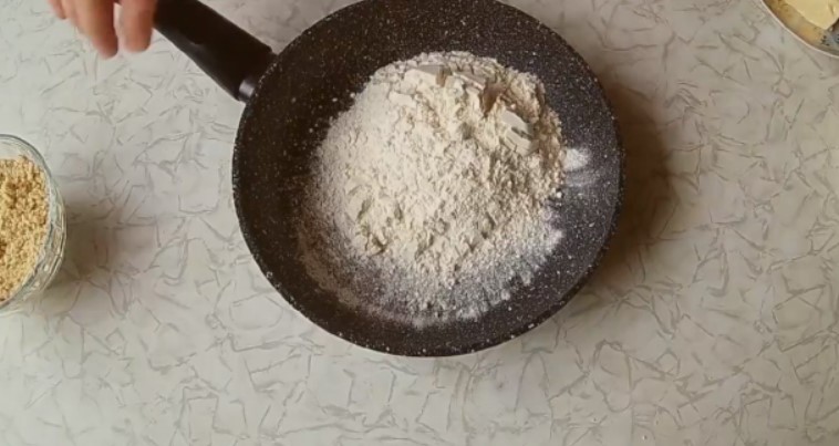 2. Борошно необхідно підсмажити на сухій сковороді, мінімальному вогні до появи кремового відтінку. Вміст сковороди треба постійно помішувати.