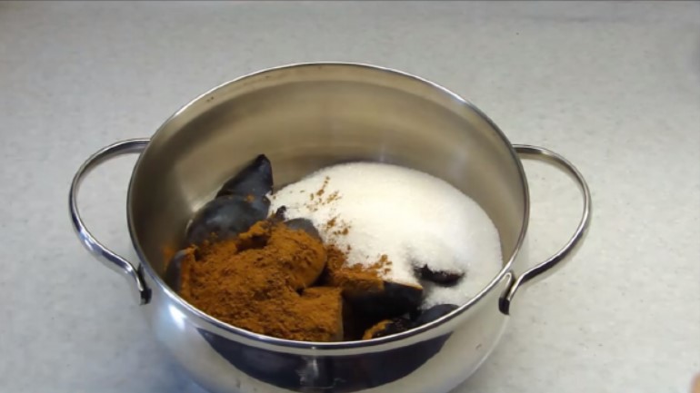 1. Перекласти В каструлю сливи, цукор і какао, перемішати. Залишити на деякий час, щоб фрукти трохи для сік (цукор місцями почне зволожуватися і танути).