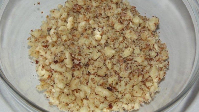 1. Горіхи треба подрібнити. Бажано не перетворювати їх у борошно, залишити досить великі шматочки. Якщо немає блендера або кавомолки, волоські горіхи можна порізати ножем. Вони маслянисті, досить м’які, зробити це нескладно. Другий варіант – це помістити горіхи в пакет і прокатати його кілька разів качалкою.