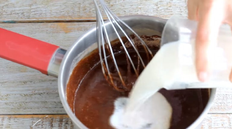 3. Зняти ємність з плити, активно перемішуючи, влити згущене молоко. Розмішати вінчиком або за допомогою міксера.