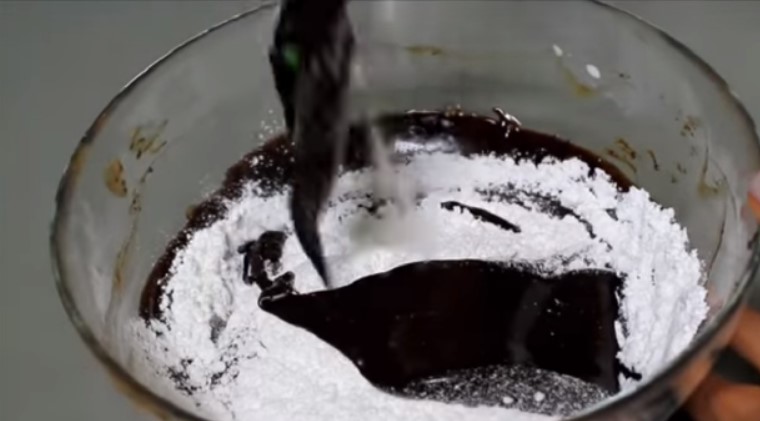 3. Додати вершки. Вони важко змішуються з шоколадом, тому деякий час їх треба розтирати лопаткою. Всипати пудру і все перемішати.