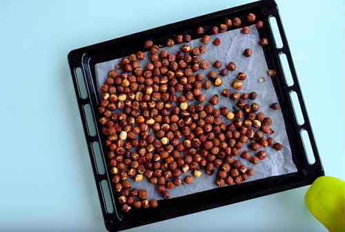Насамперед, підсмажимо горіхи, щоб розкрити їх неповторний аромат. Застеліть деко пекарської папером, розсипте фундук. Поставте в духову шафу на чверть години. Далеко не відходьте, помішуйте кожні 5 хвилин, щоб уберегти від підгоряння.