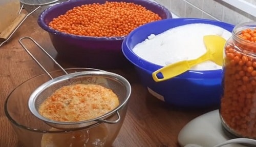 - Переберія обліпиху, обполосніть, підсушіть. Пропустіть через соковижималку. Заміряйте об'єм в літрах. Порахуйте, скільки необхідно зварити сиропу.