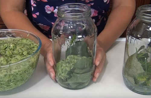 Укладіть в банки парасольки кропу, листя з переліку в рецепті, перець.