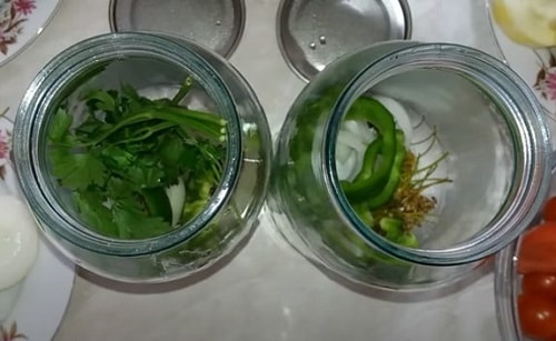 - Покладіть в банки спочатку по гілочці петрушки з кропом. Покладіть по кілька кілець морквини, зубчик часнику, смужки солодкого перцю.
