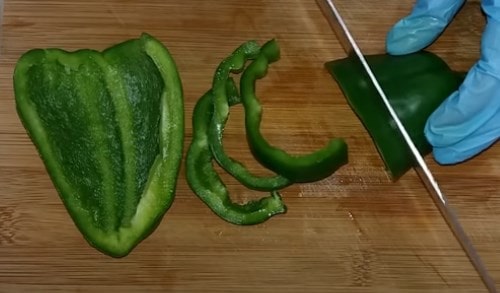 У болгарського перці виріжте насіння з перегородками. М'якоть настругати півкільцями.