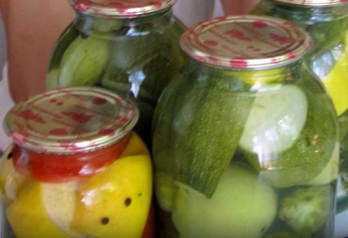 - Залийте в асорті з кабачків з овочами і огірками, відразу укупорьте під ключ. Переверніть догори дном, охолодіть під теплим укриттям. Винесіть в підвал або льох.