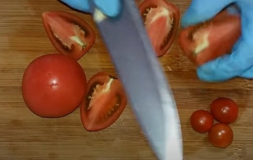 Дрібні помідори залиште цілими, великі поділіть на 2-4 частини. Місце у плодоніжки видаліть.