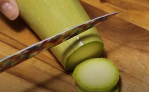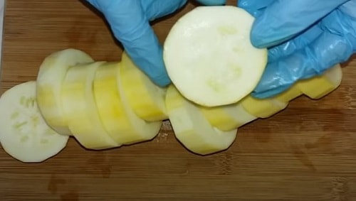 Наріжте кабачки кружечками, при необхідності видаливши насіннєву частина.
