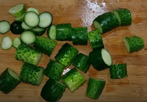 Огірочки бажано спочатку замочити на пару годин. Потім обріжте кінчики. Наріжте на кілька не надто великих частин.