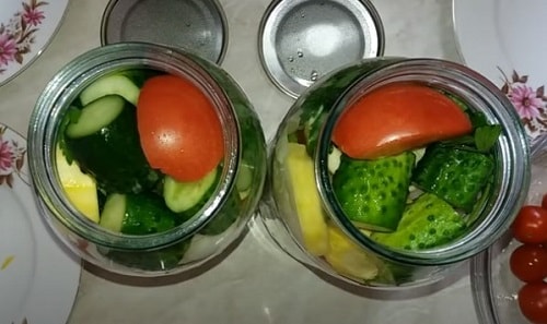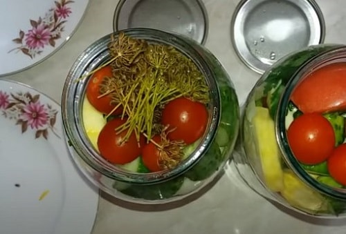- Простерилизуйте банки. Покладіть овочі по черзі чергуючи шари. Старанно утрамбуйте.