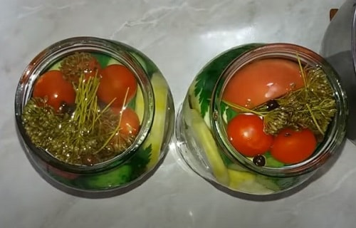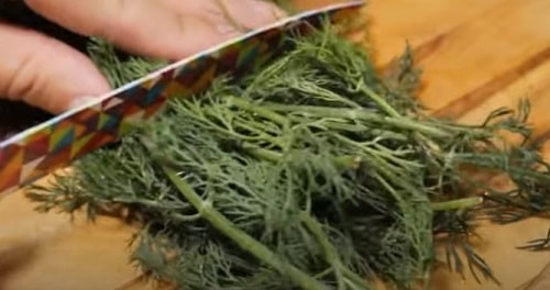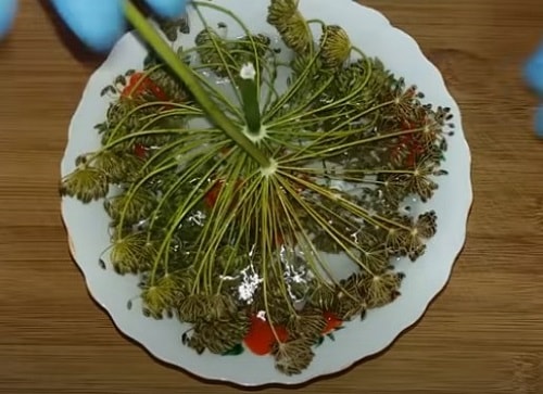 Зверху накрийте овочі парасольками кропу і покладіть по парі горошин перцю.