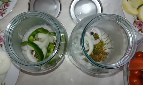 Закиньте в кожну банку горошини перцю, трохи кропу, кільця цибулі і солодкого перцю.
