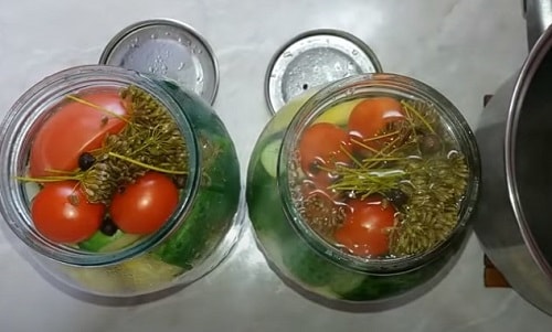 Залийте банки окропом. Прогрійте овочі протягом 10 хвилин. Потім злийте настій в каструлю, знову закип'ятіть і поверніть в банки.