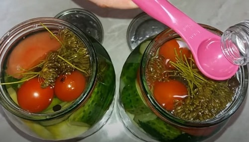 - Зробіть подвійну заливку, щоб овочі гарненько прогрілися. Втретє зваріть з настою маринад, додавши цукор, сіль, оцет.