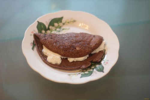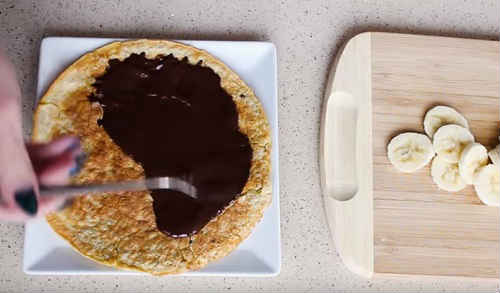Промажте половинку млинчика розтопленим шоколадом.