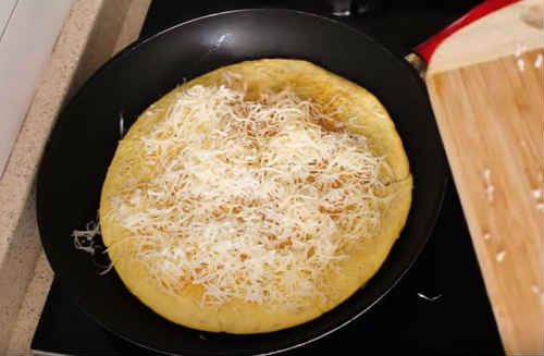 Налийте на суху сковороду тісто. Коли одна сторона обсмажиться, переверніть млинець, насипте сирну стружку (ви не помилилися, ще на сковороді).