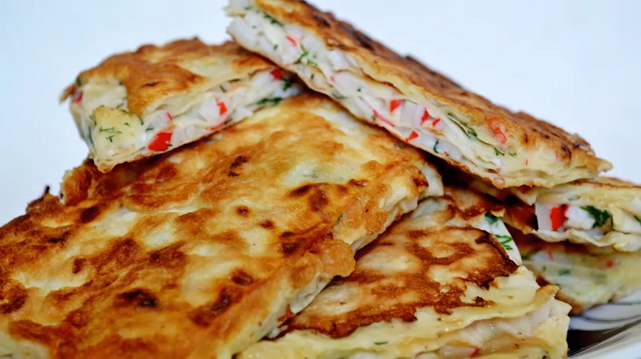 Східні грінки з лаваша з начинкою з крабових паличок — це дуже просте, смачне і швидке блюдо на сніданок.