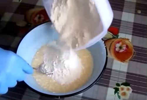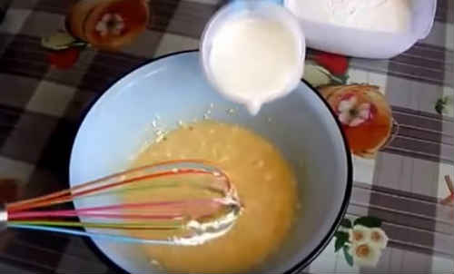 Влийте теплий кефір. Спеціально його не прогрівайте, просто раніше дістаньте з холодильника і поставте в тепло. Слідом перелийте дріжджі, знову добре попрацюйте віночком.