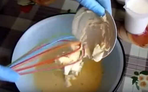 Потім перекладіть масло (дістаньте його заздалегідь, щоб воно размягчилось як слід). Старанно збийте масу віночком.
