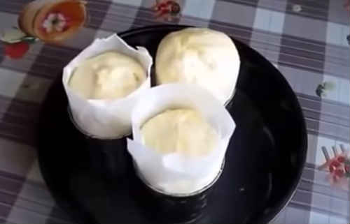 Розкачати це тісто буде досить проблематично, тому візуально поділіть тісто на кількість формочок. Наповніть їх (якщо потрібно змащення форм, то промажте обов’язково), але не доверху, оскільки тісто добре підніметься. Укладіть приблизно на третину форми, розправте і розрівняйте верх.