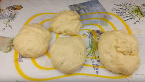 Готове тісто поділіть на 4 частини, три з них зробіть меншого розміру, ніж четверта. Руки і робочу поверхню обов’язково змастіть маслом, тоді працювати з липким тістом стане легше.